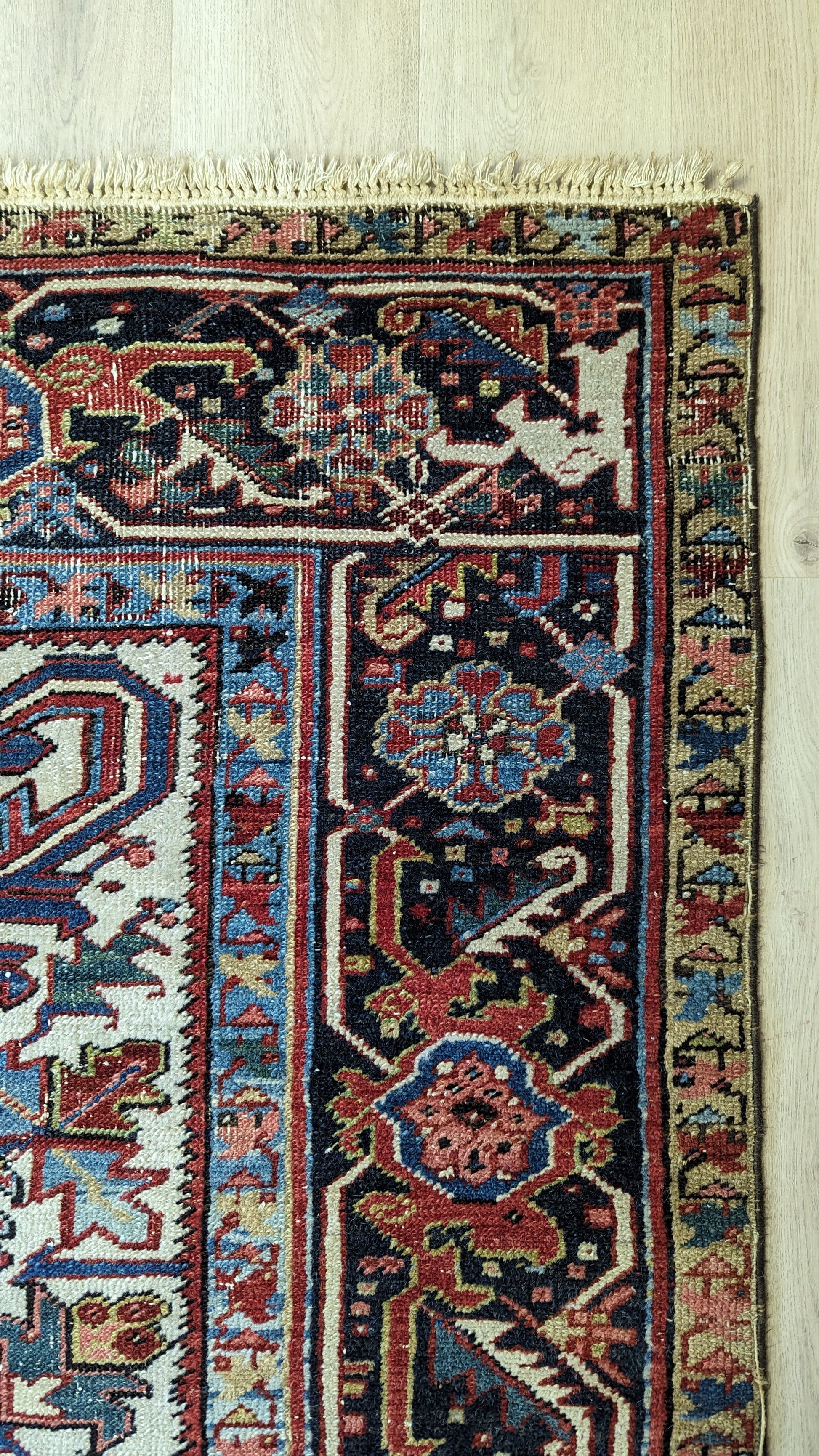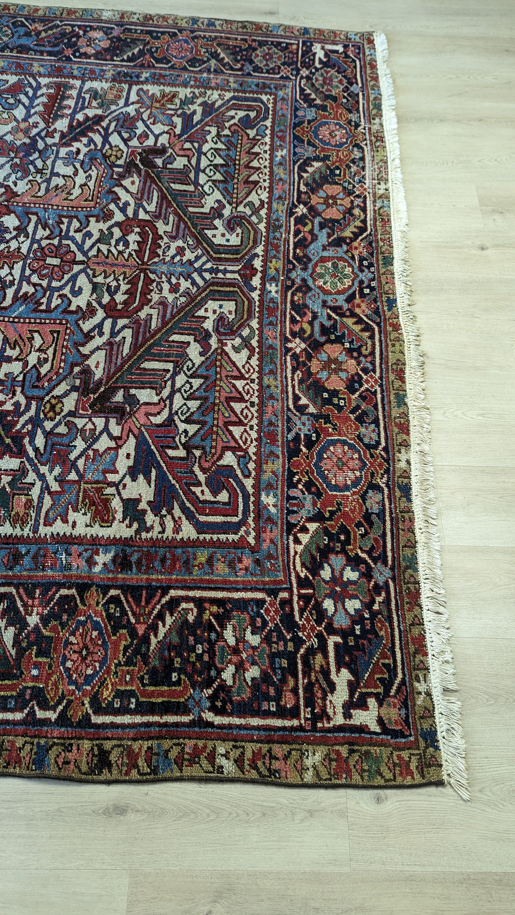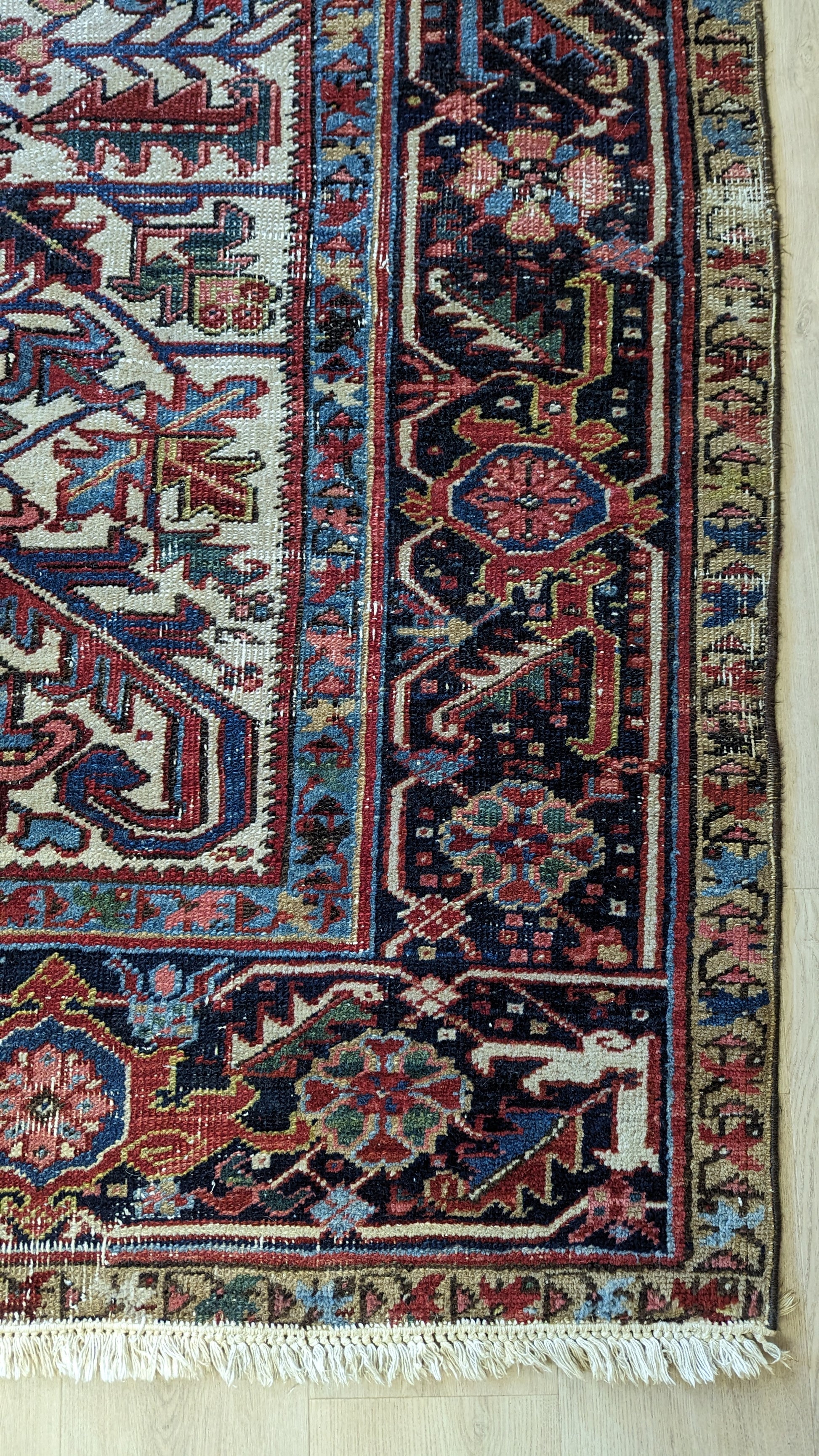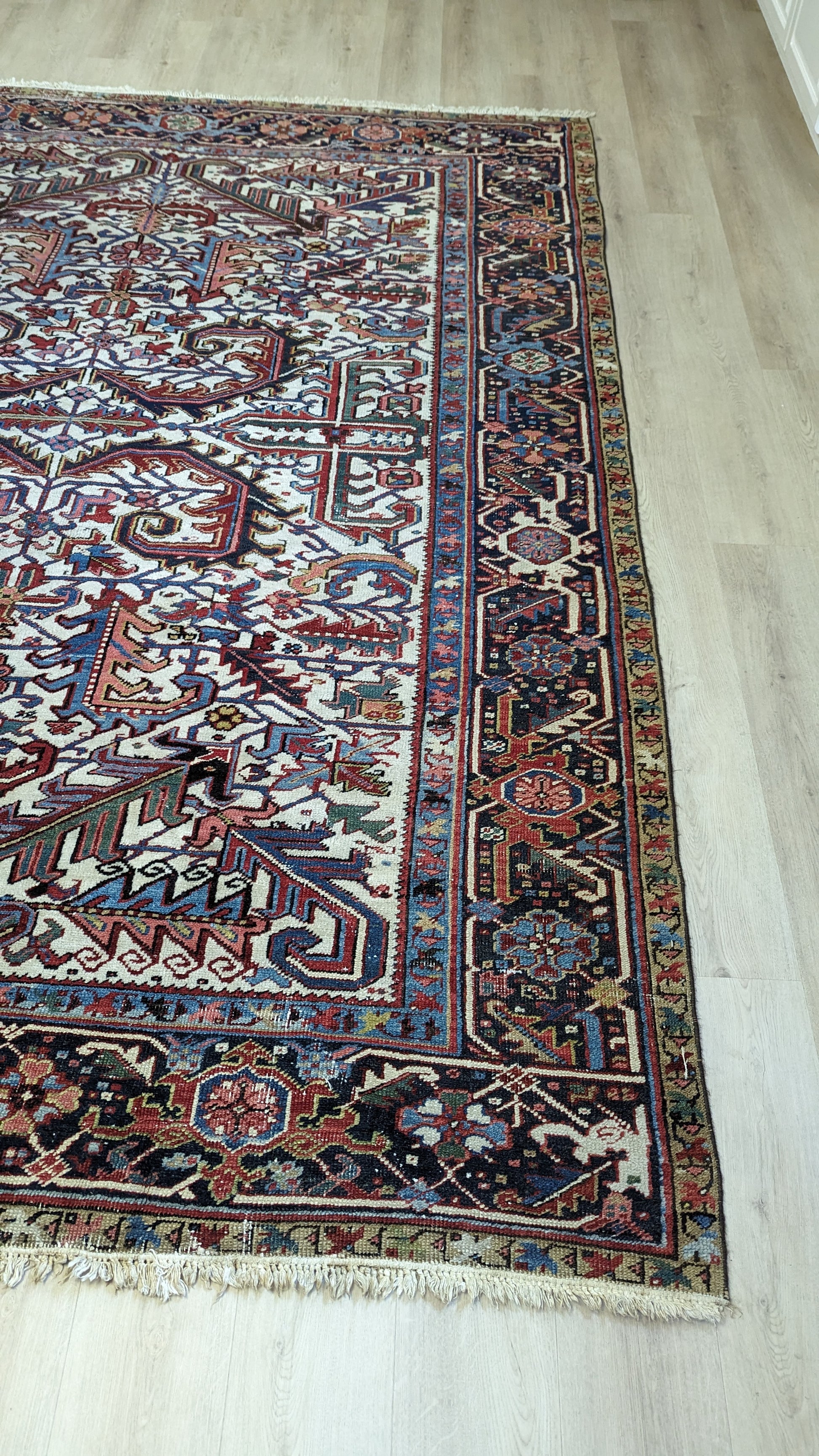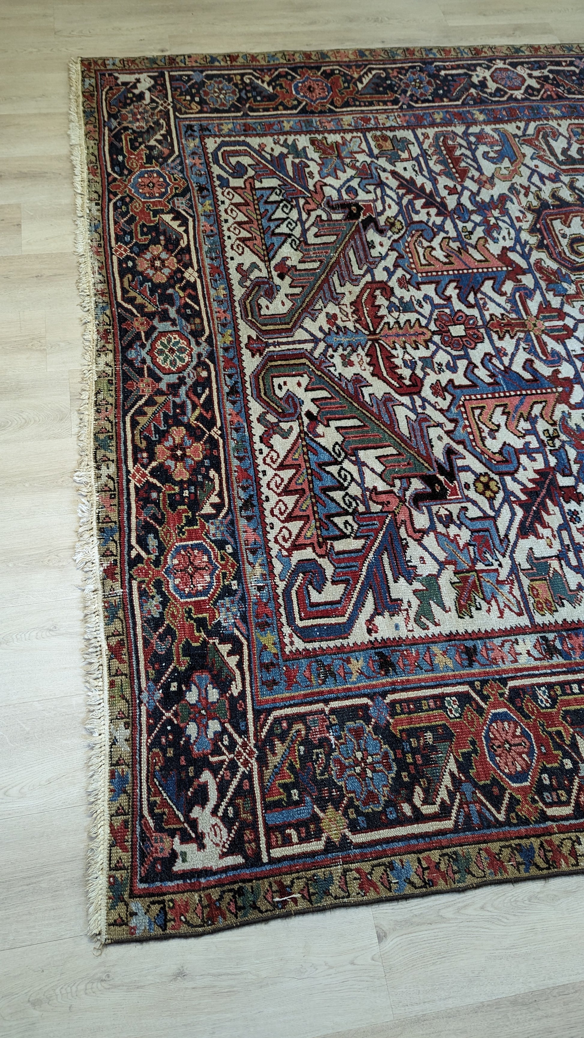 A genuine, antique, hand-knotted Persian Heriz rug adds color, warmth, and timeless charm and to complement any decor style.
