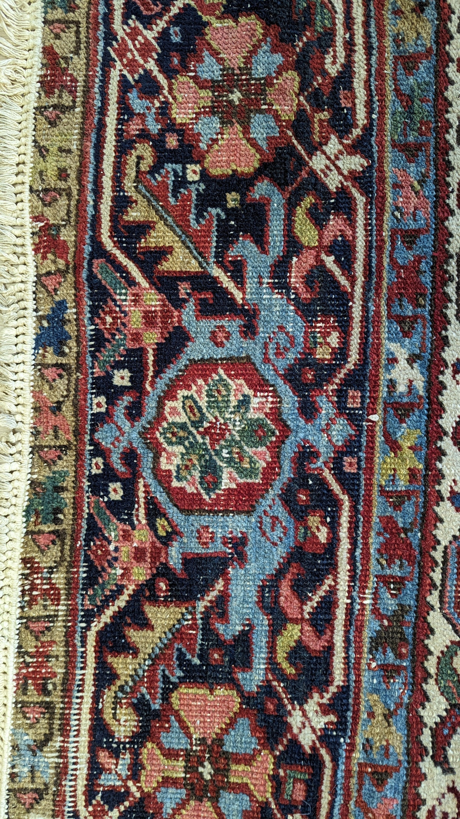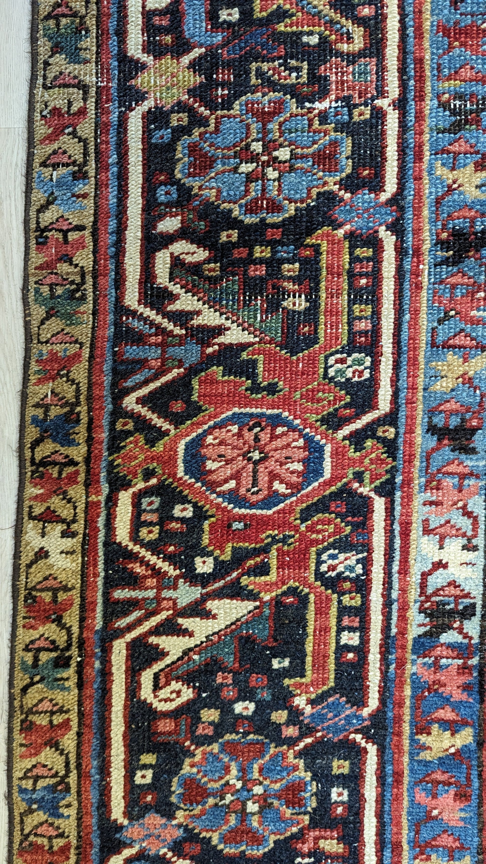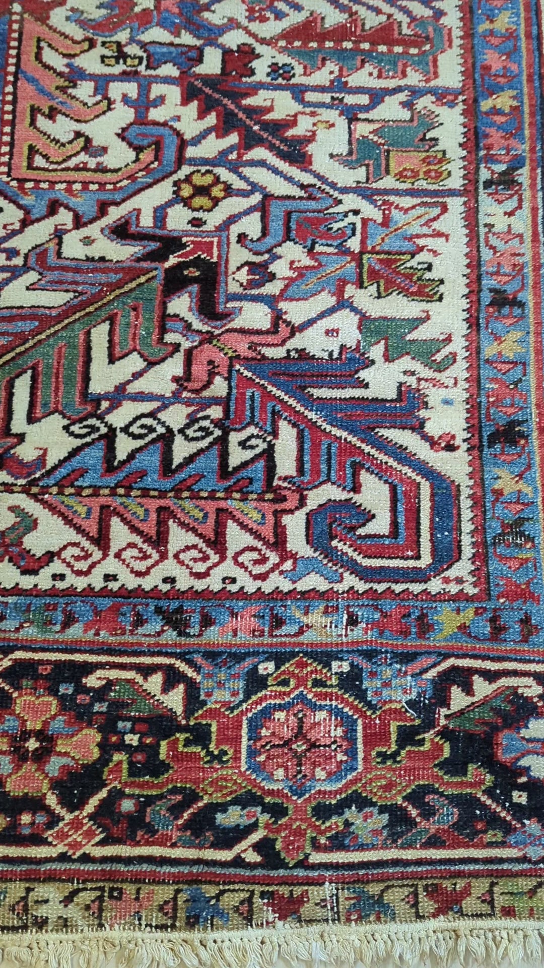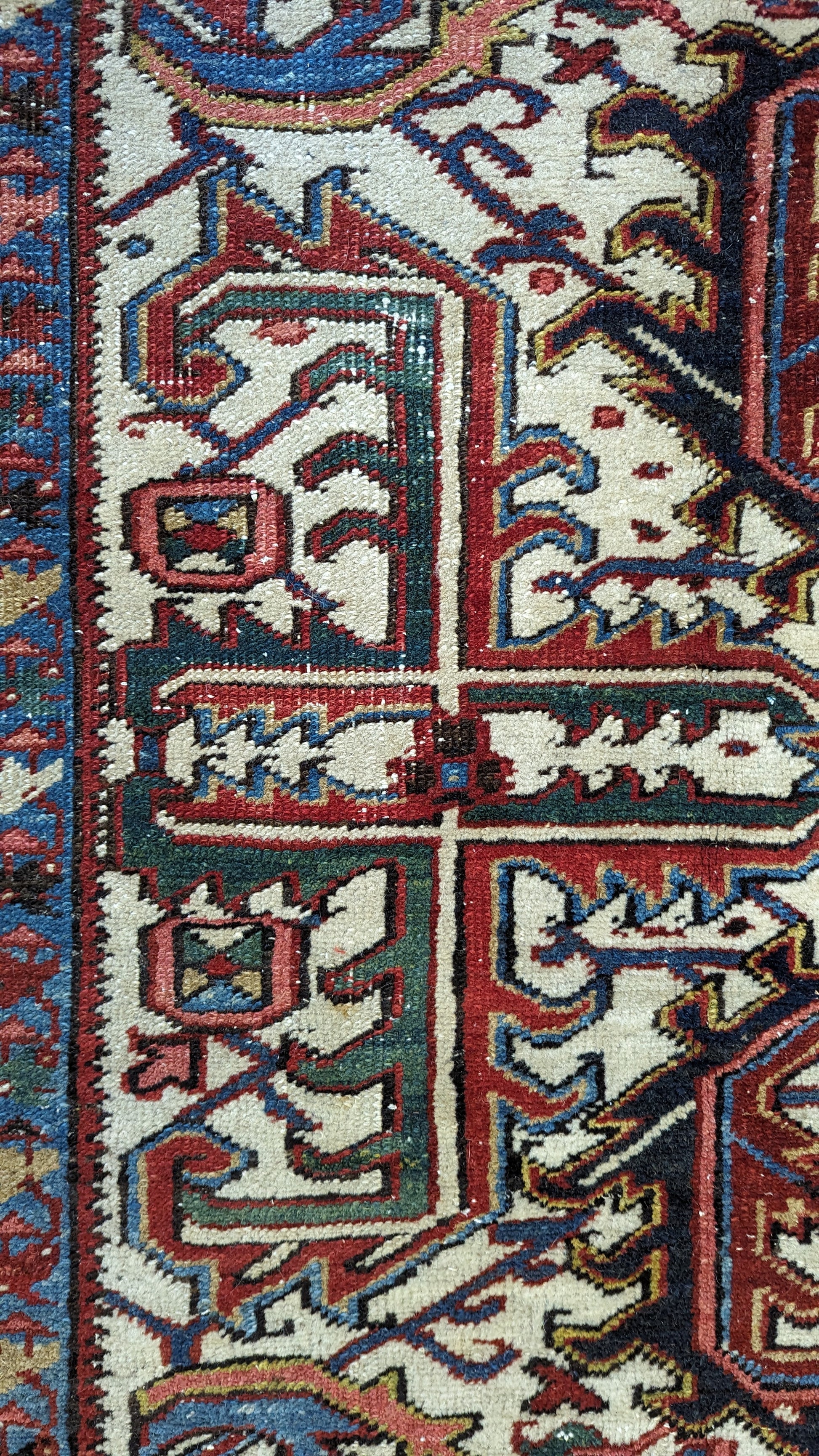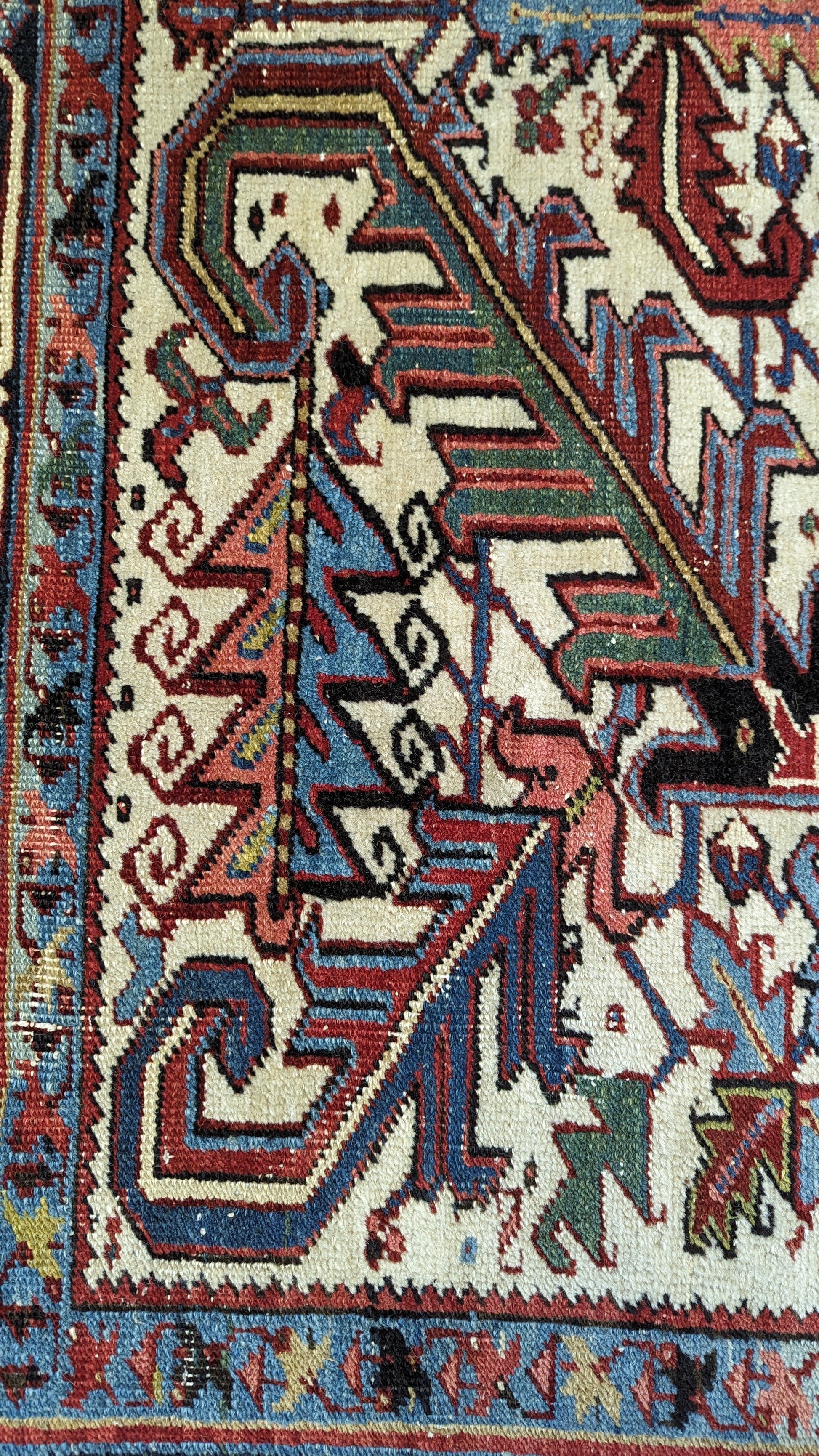 A genuine, antique, hand-knotted Persian Heriz rug adds color, warmth, and timeless charm and to complement any decor style.
