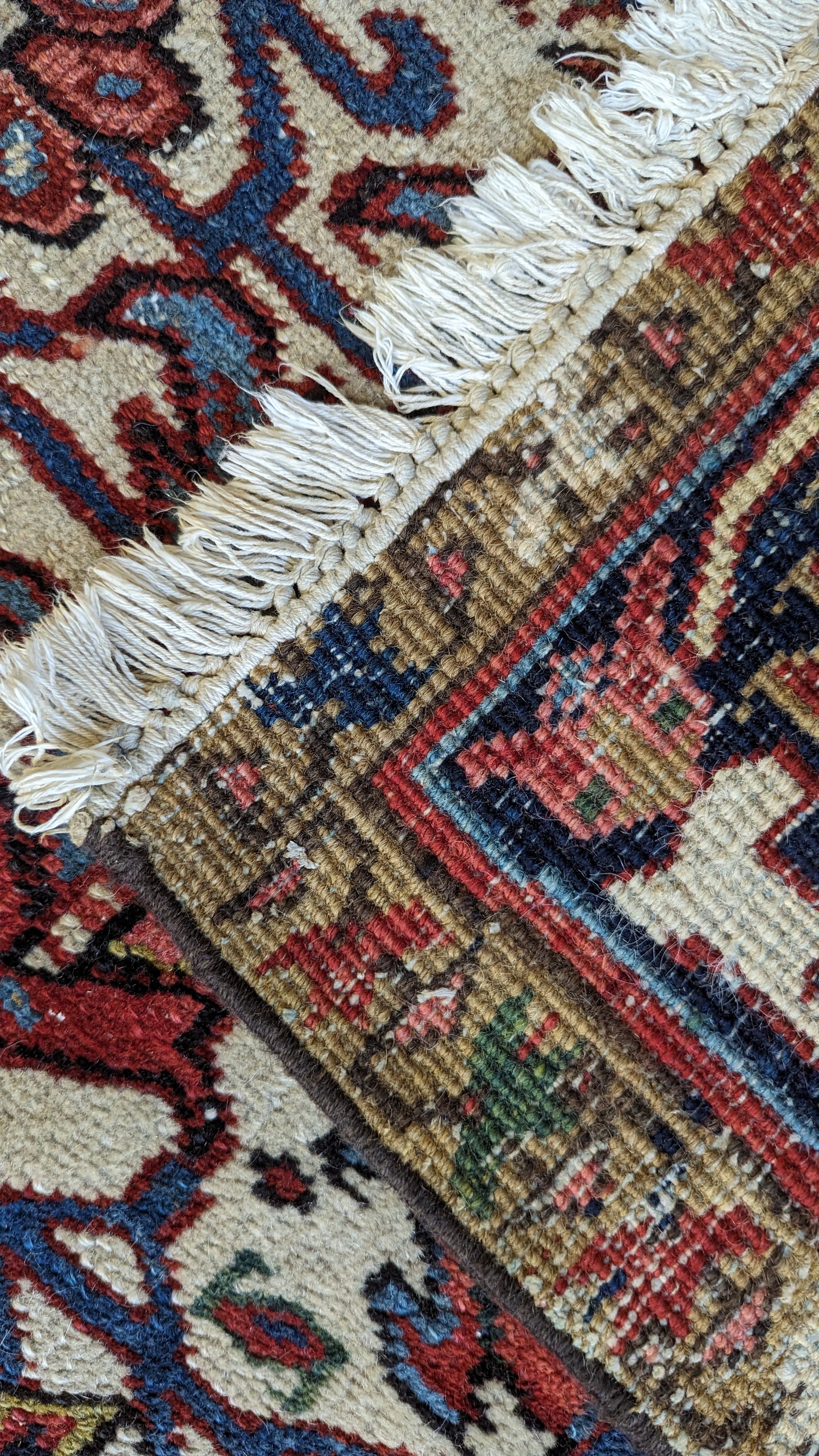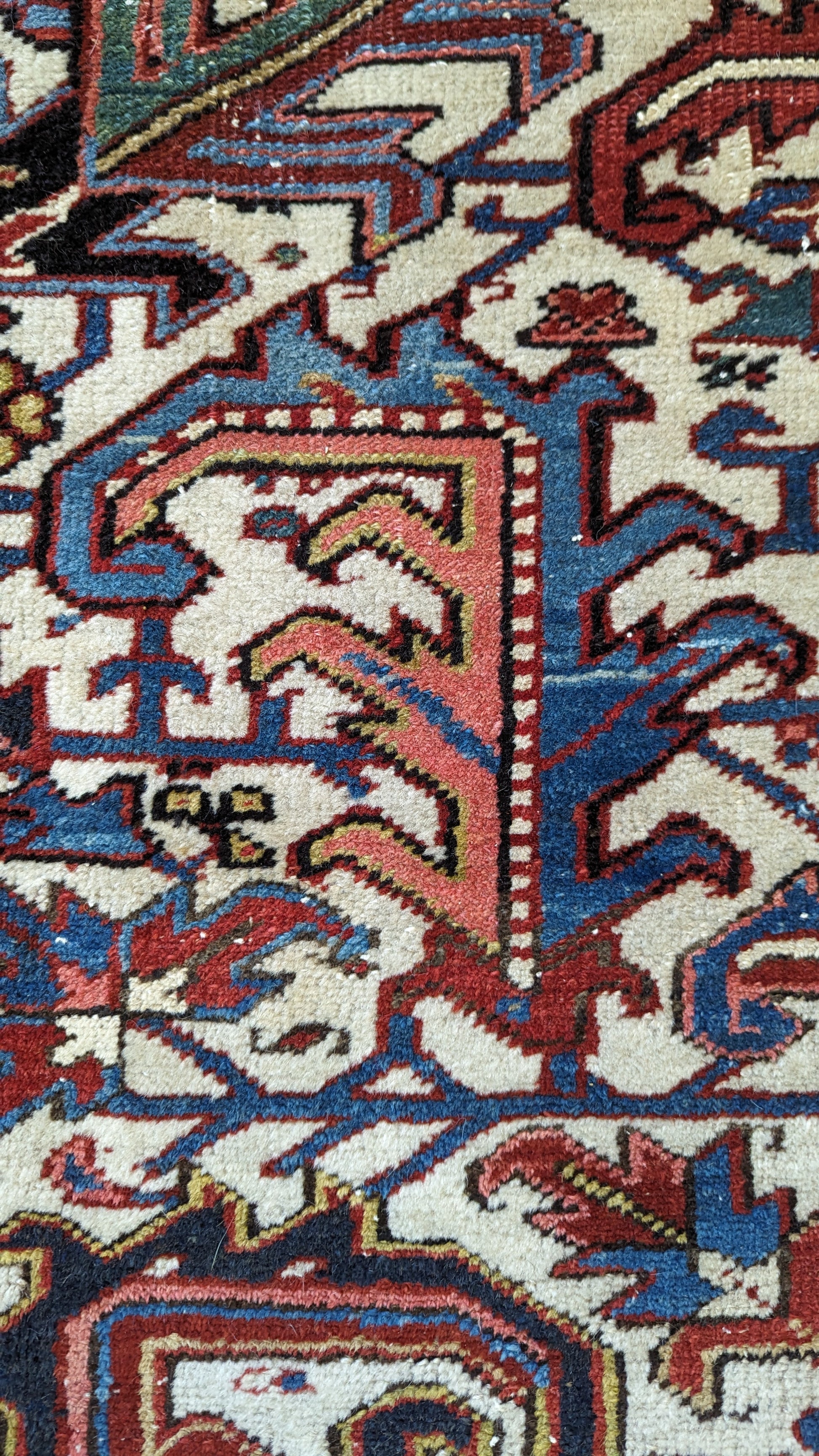 It also offers a couple of other prized qualities which are rare, even among authentic, antique Persian Heriz rugs. First, the background color is ivory, rather than the much more common red. Secondly, it features an allover design instead of the more commonplace central medallion. The allover design is more versatile for furniture placement in modern decor.
