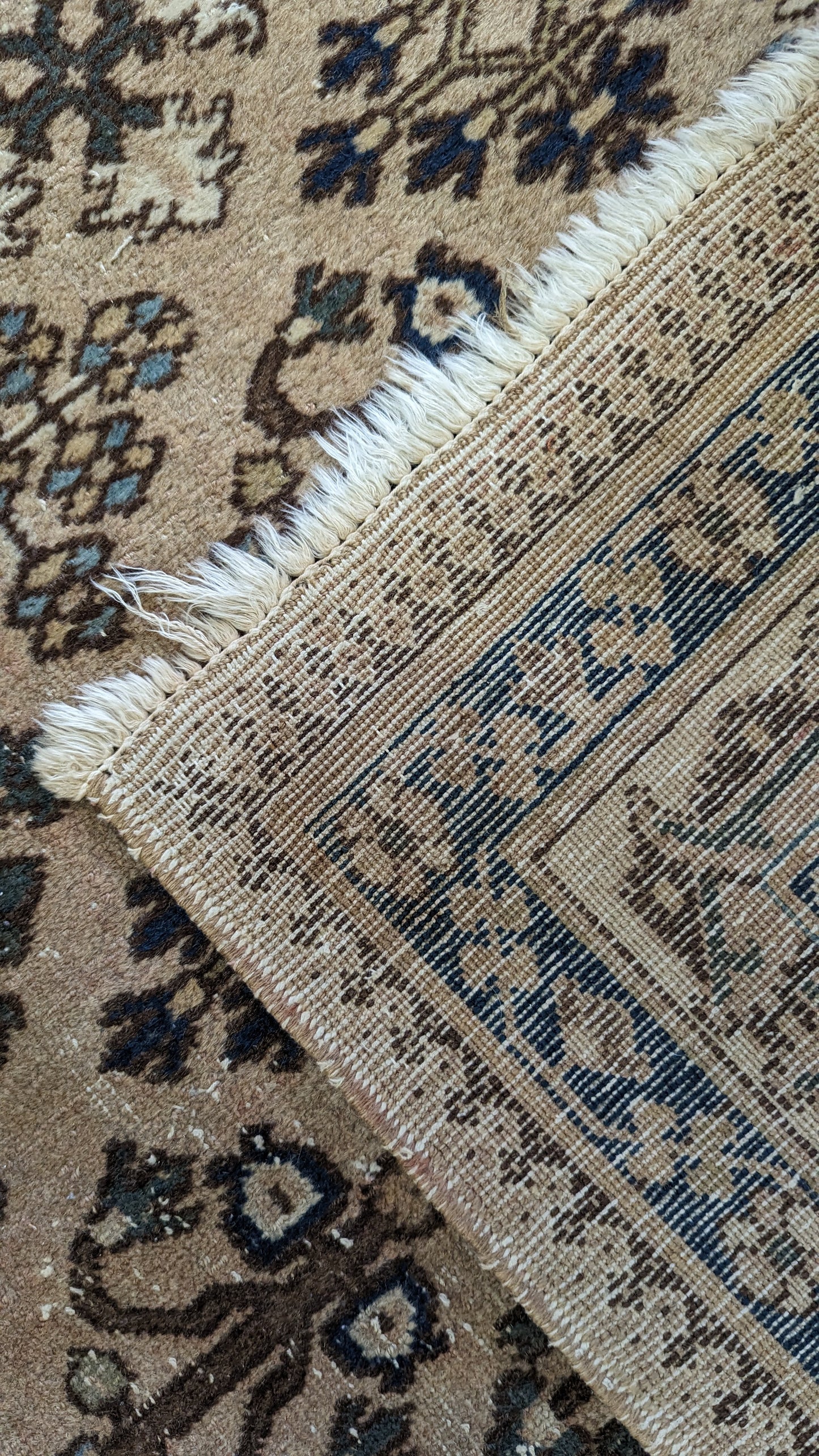 In terms of condition, the design shows beautifully. The rug has no rips, tears or stains. However, the rug shows significant wear, consistent with its age
