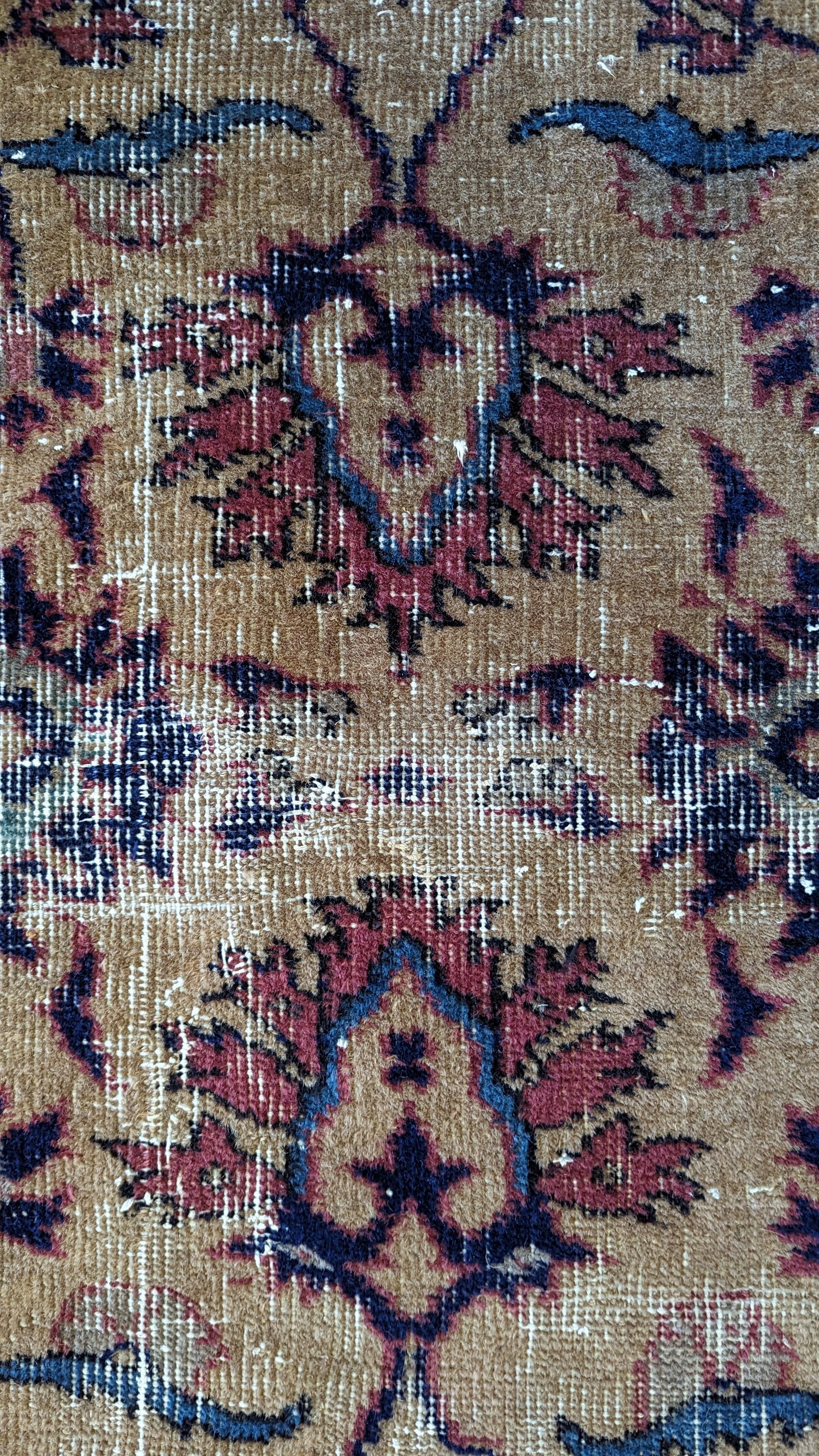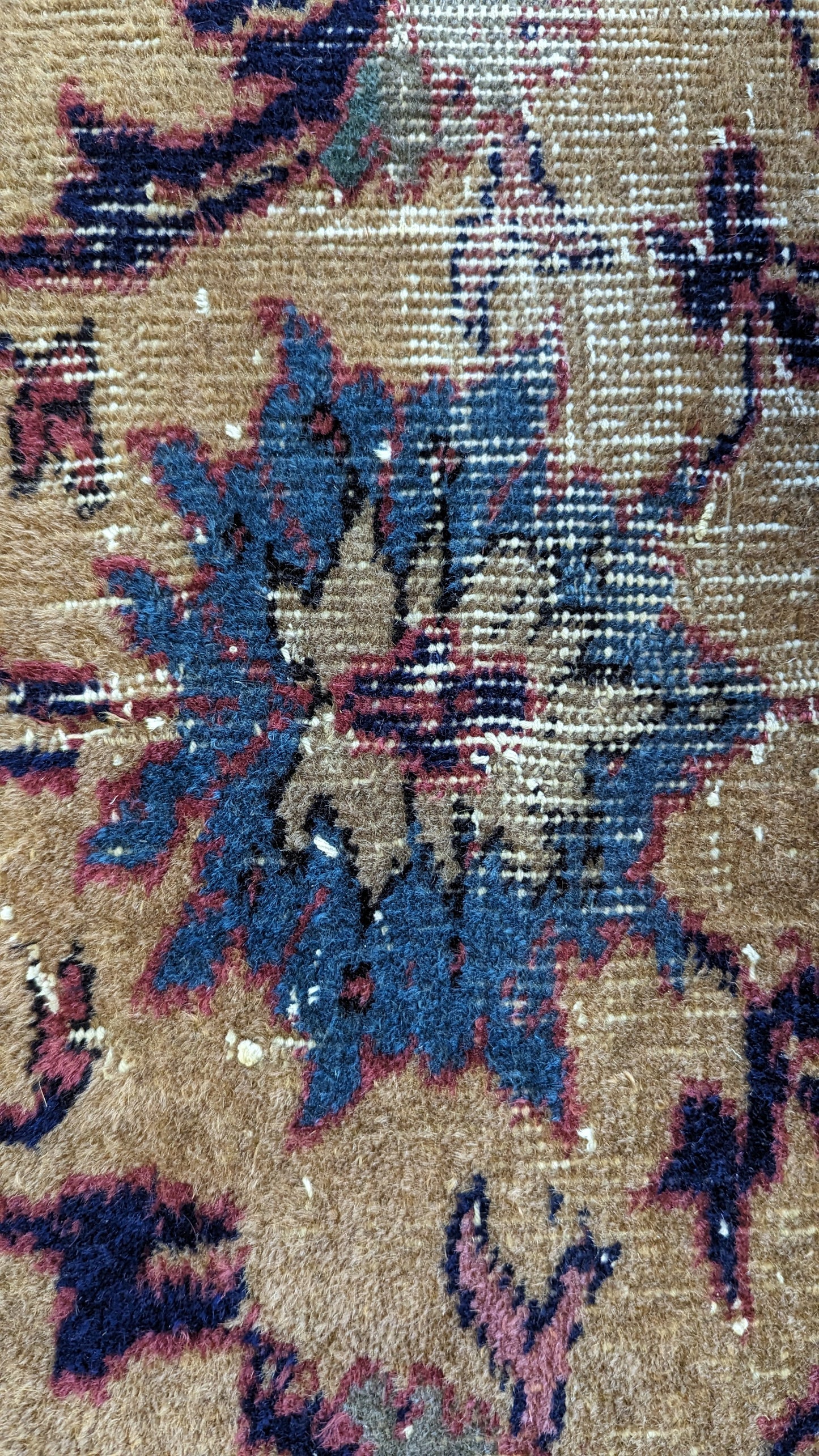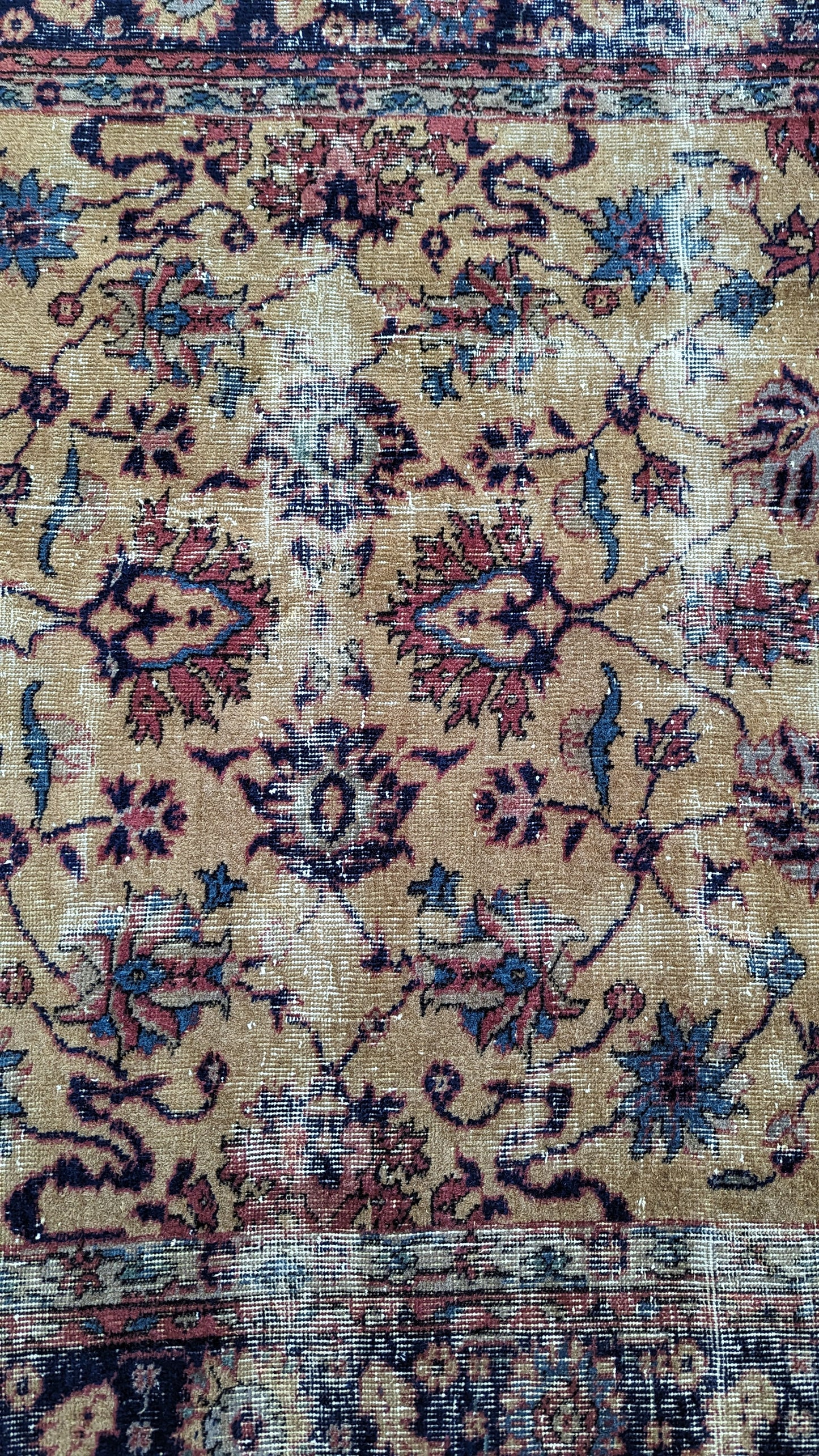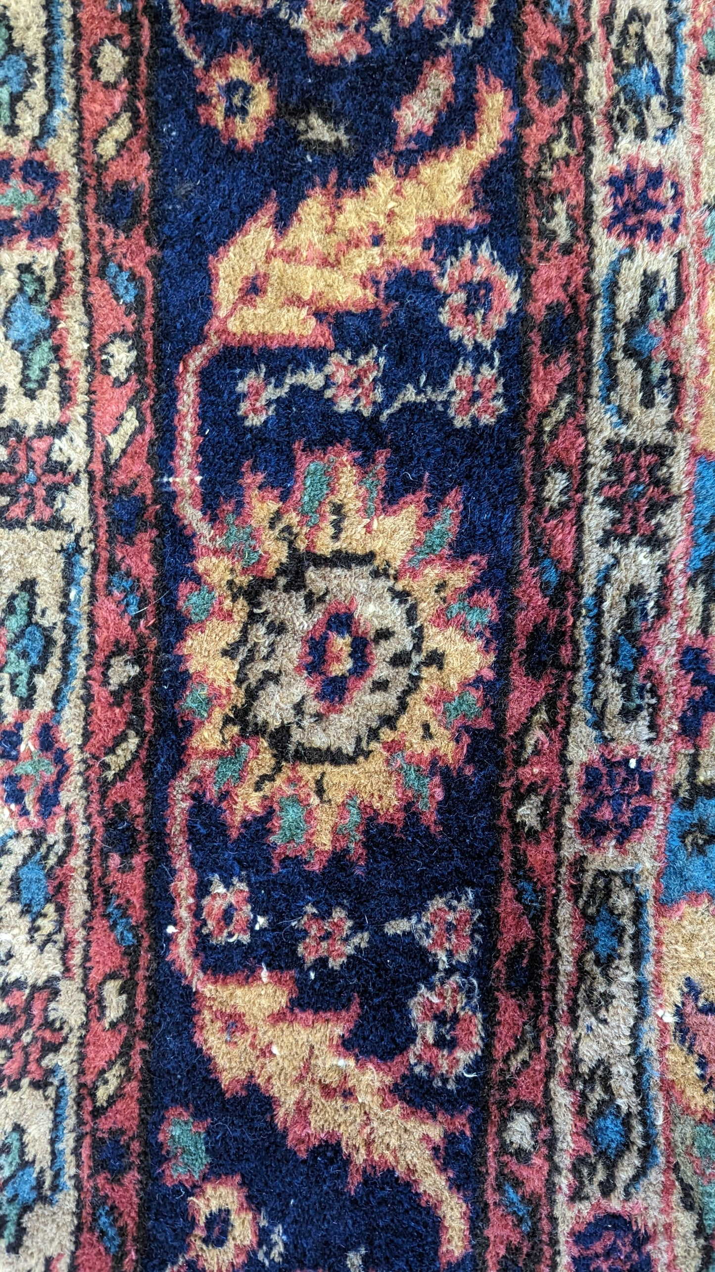 I washed the rug by hand on April 12, 2024,, and carefully stored it since. It is in heavily worn condition, consistent with its age.