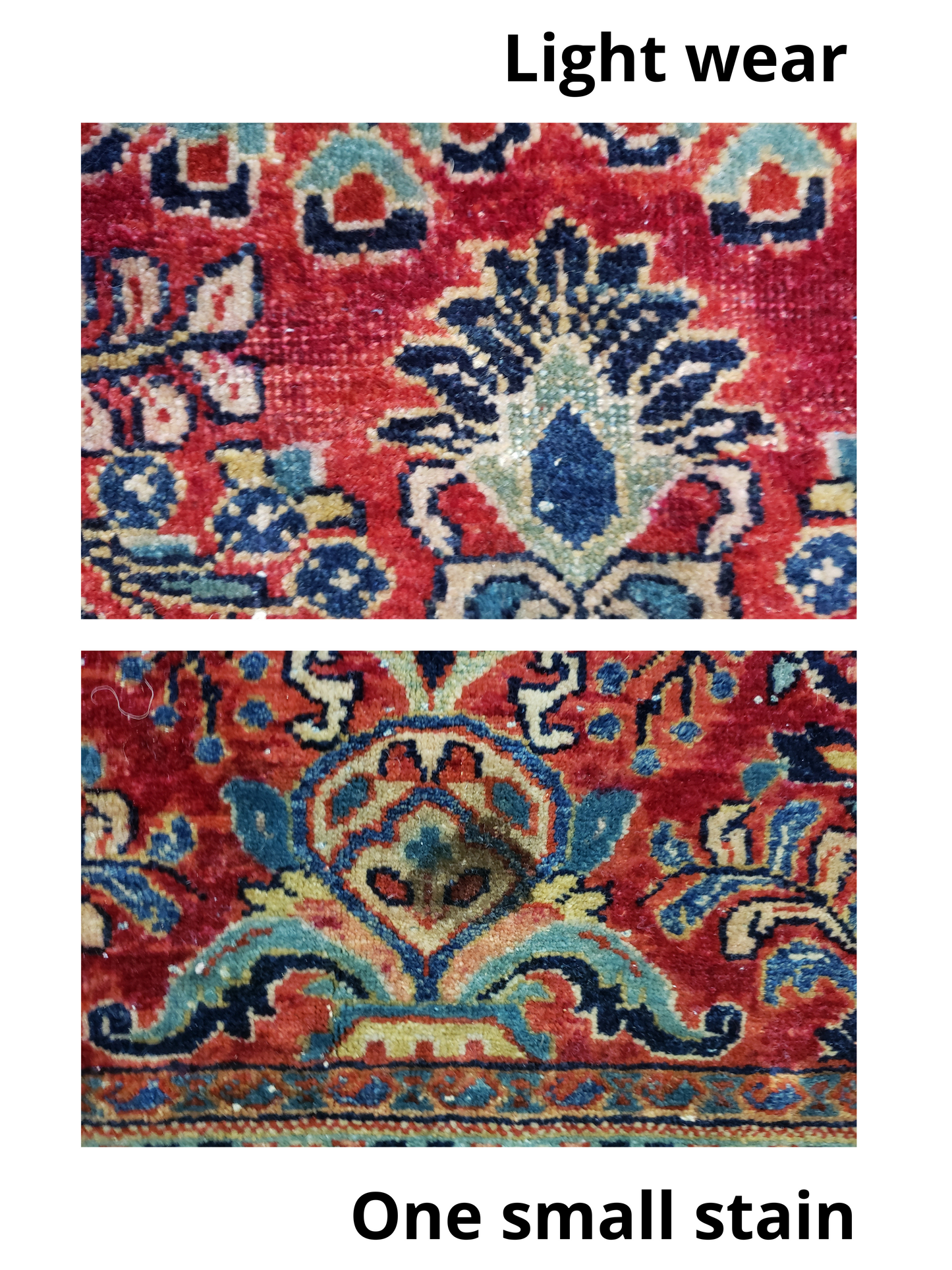 The rug is in fair-to-good antique condition. The colors and design show beautifully! The wool pile shows a bit of wear, consistent with its age. A small stain appears near one end, as shown in the final photo, but the stain blends in easily and can be covered by even the smallest furniture leg.