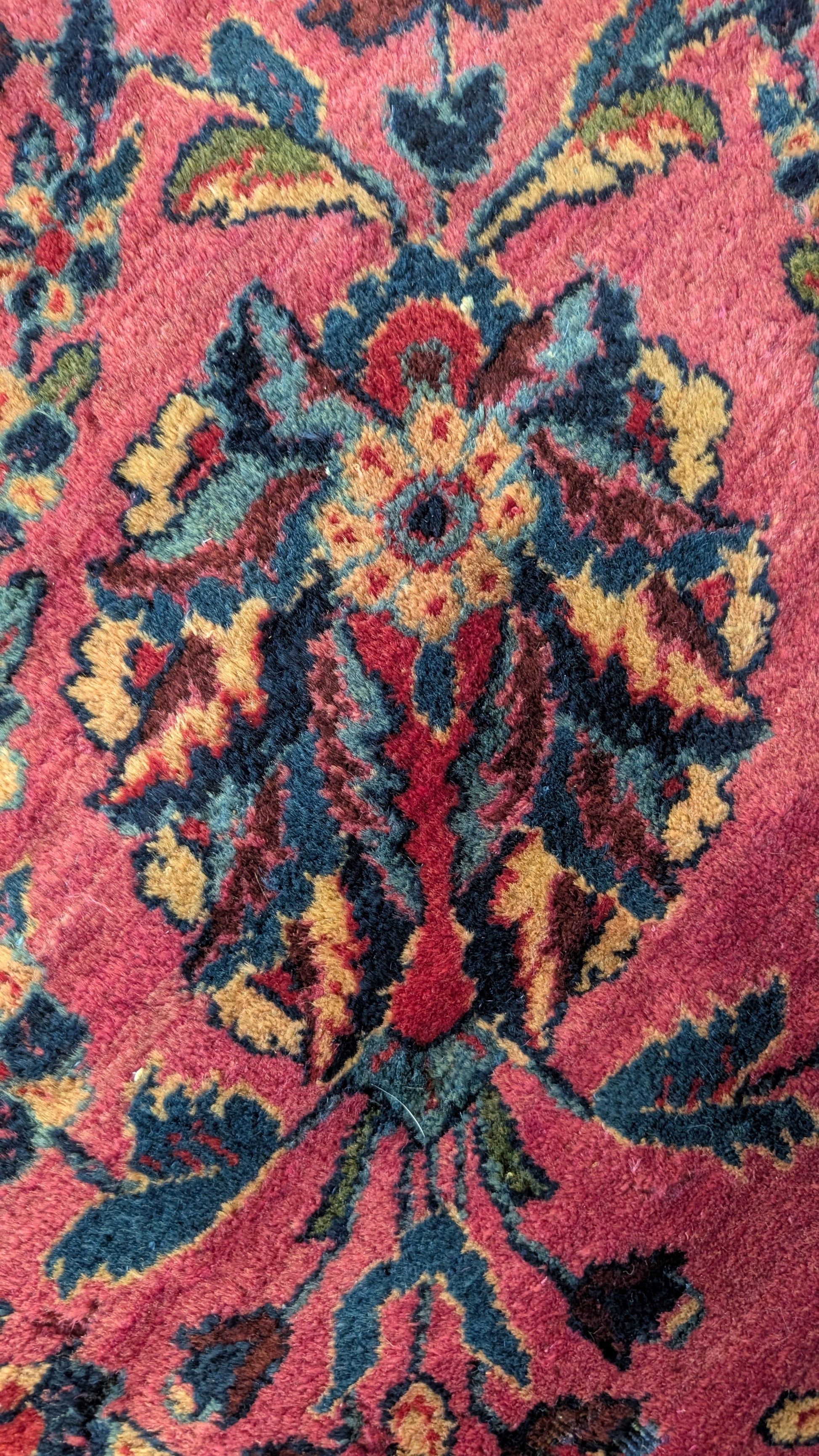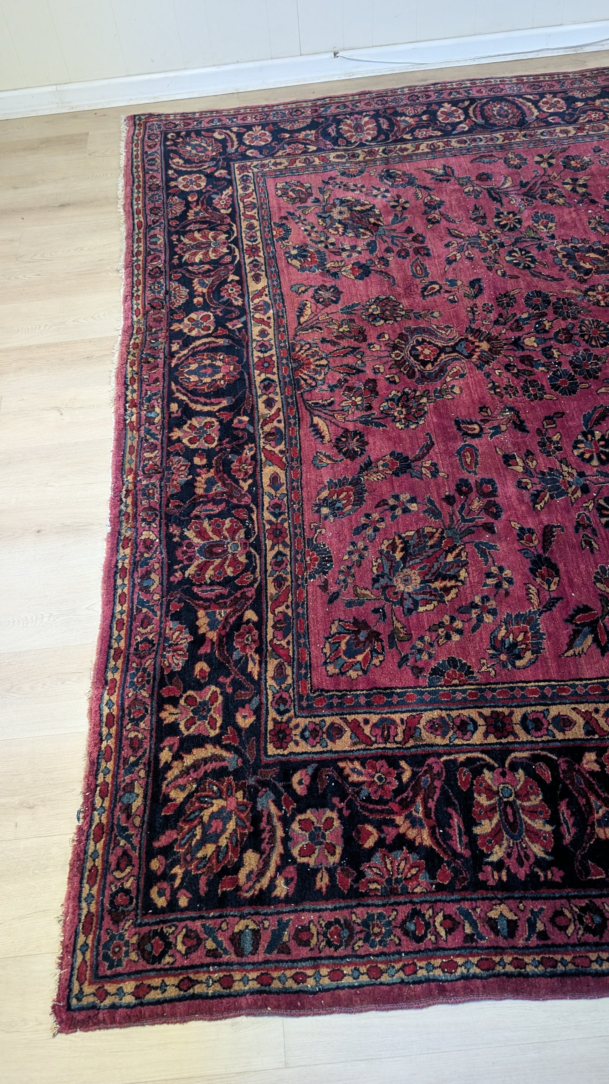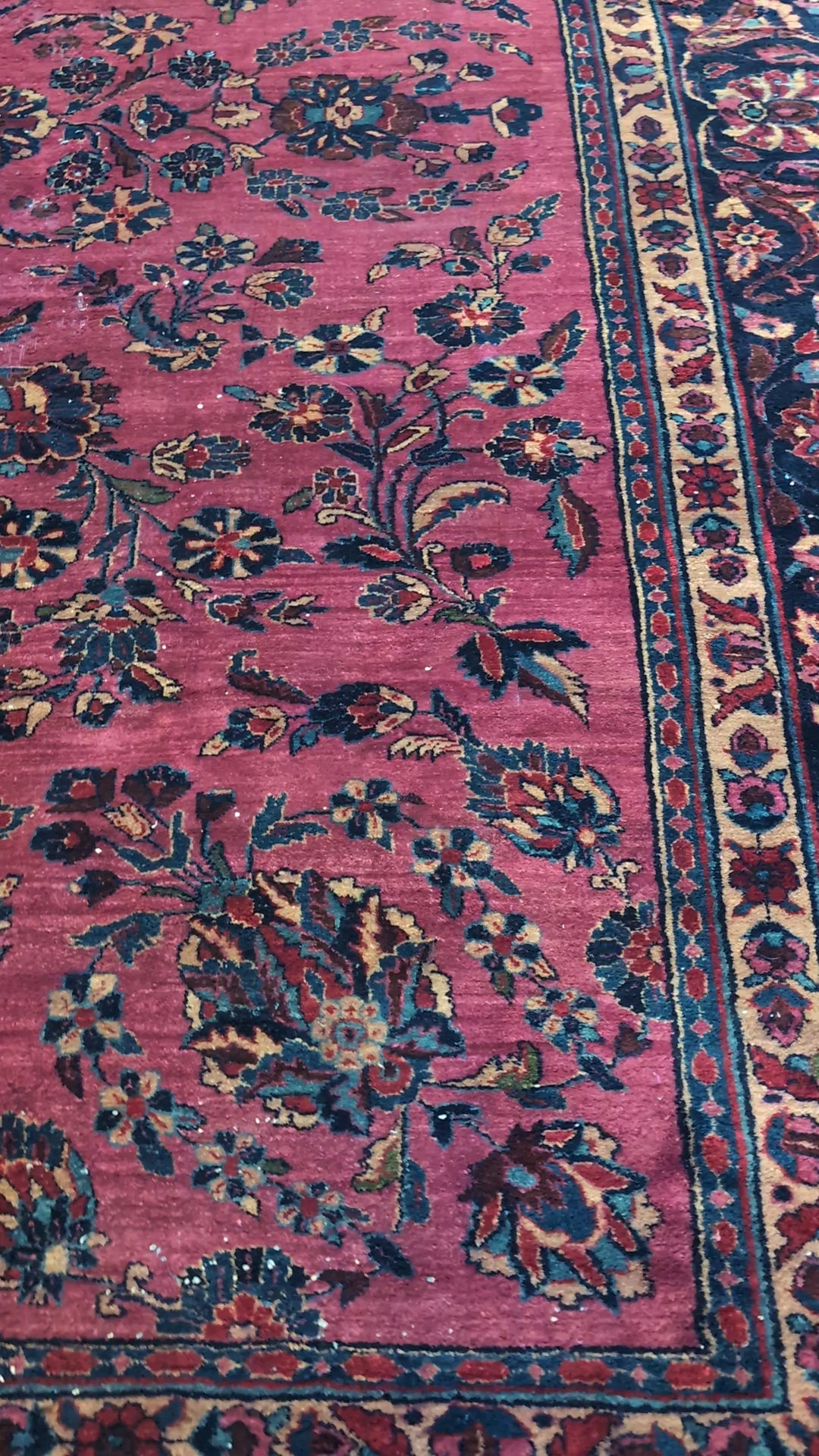 A century-old Persian Sarouk rug, woven circa 1920s, with lustrous wool and amazing, enduring colors that shimmer softly in natural light. The design glows with floral grace and timeless Persian artistry.