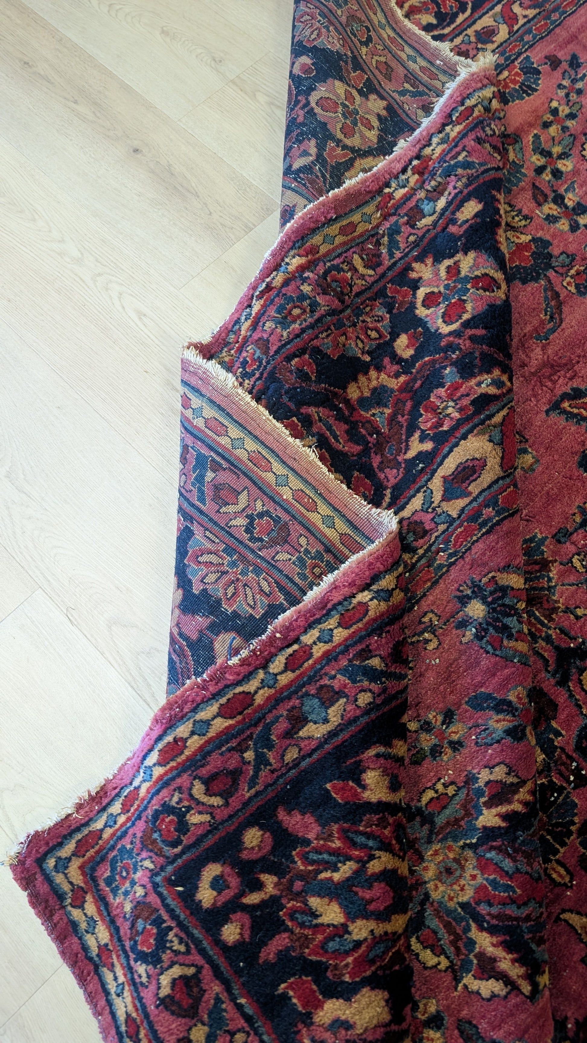 This piece shows its age with character: wear and damage affect roughly 12% of the wool pile, adding to its storied authenticity. It has been recently washed and carefully stored, ready to grace its next home with quiet warmth and history.