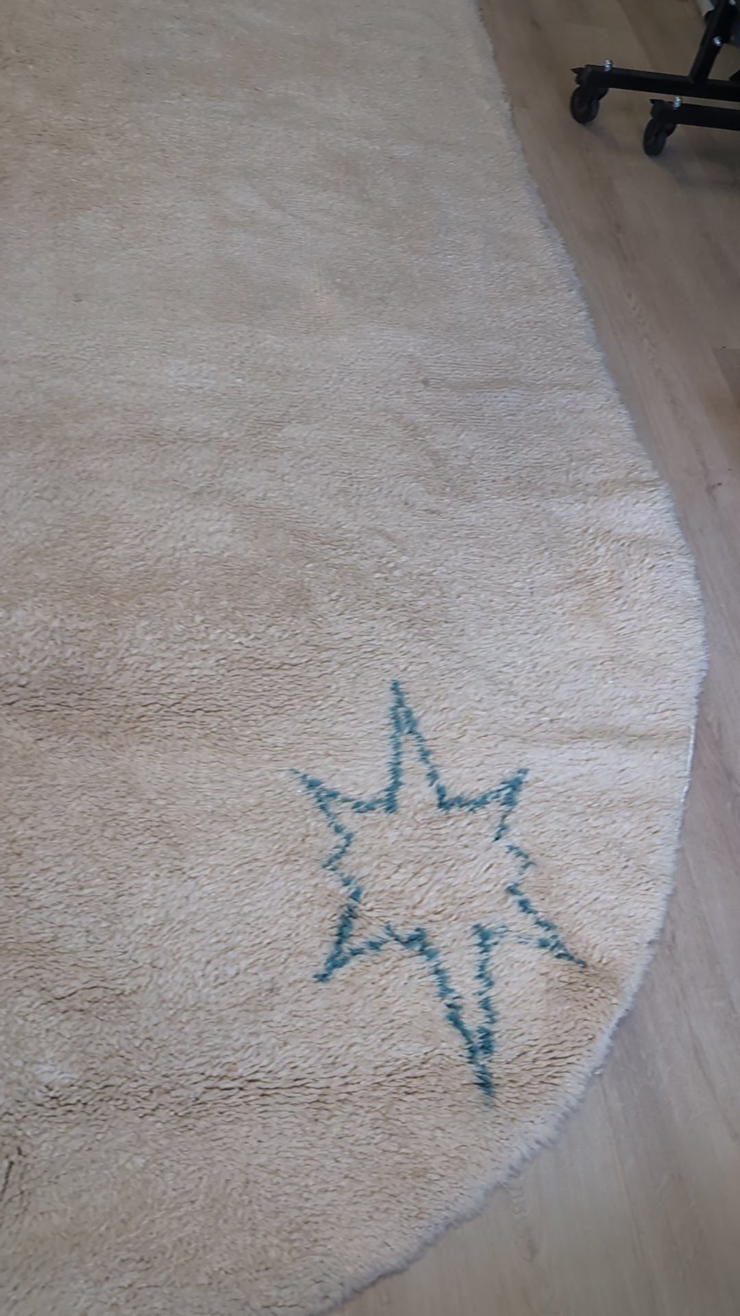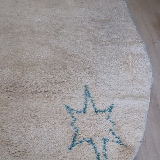 A striking and unusual shaped Moroccan rug, hand knotted in thick, plush wool, and rendered in a soft ivory field with subtle sky-blue star motifs.